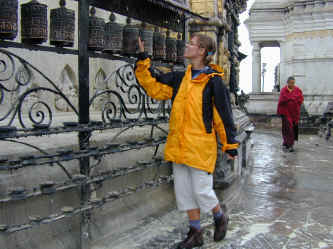 Kelly turns the prayer wheels at the Monkey Temple (notice the monk in the background). When walking around a stupa or turning prayer wheels, clockwise only is the order of the day.