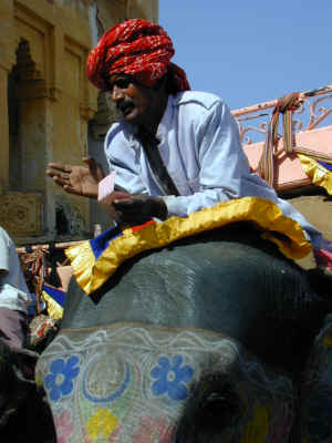 Hindu man in Jaipur, India offers us a ride on his elephant at the Amber Fort. |