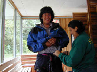 Kelly and Rich are fitted in their harnesses which would be used to attach
