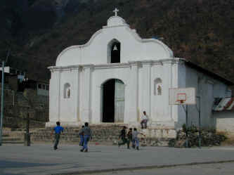 In the village of Santa Cruz, boys play futbol outside of the church.