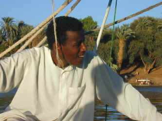 I am captain of the Copenhagen felucca, which is an Egyptian sail boat. I have been sailing felucca boats on the Nile in Upper Egypt for three years. I love to sail. My dream is that some day I will have enough money to buy my own felucca. It is going to be very big and nice. I am twenty years old and one of ten children in a large Nubian family. My mother is forty-five years of age, while my father is seventy years. My parents married when my mother was only fifteen. My father works in Saudi Arabia as a cab driver. I guess the money is better there than in Egypt. I live in a small Nubian village just north of Aswan. The population in my town is just 1500 people. Would you like to come and meet my family? My favorite Egyptian dish is Koshari, which is made of macaroni noodles, rice, black lentils, fried onions and tomato sauce. It is delicious. My favorite type of tourist is the Japanese tourist. They pay the most money. My favorite movie is one with Jackie Chan. Aswan cinema does not play American movies. I do not know who Michael Jordan is, but I do know of Michael Jackson. I like his music. I also like Bob Marley. If you would like to ride in my felucca, just go to the Mona Lisa restaurant which is located right on the Nile in Aswan, Egypt. Ask for Captain Abdul.